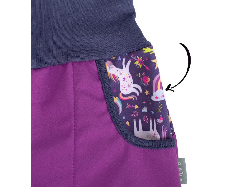 Softshellové dievčenské nohavice s jednorožcami sa dajú spolu s bundou zložiť do malého balíčka, ktorý vám ušetrí miesto. Na vonkajšej zadnej strane nohavíc je pridané nové pútko, ktoré sa nikdy neodtrhne, je reflexné a vďaka jeho veľkosti si s ním poradia aj malé detské pršteky. Už žiadne váľanie mokrých nohavíc po zemi. Softshellové nohavice pre dievčatá majú aj nový dizajn vreciek a zvyšujú ochranu dieťaťa reflexnými prvkami.